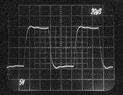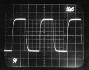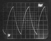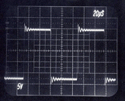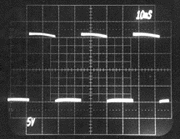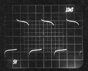 The following oscilloscope photos were taken to demonstrate the superiority of the Berning impedance converter over an high-quality audio-output transformer. Each pair of photos was taken when the same tube amplifier was coupled to the same resistive 8 Ohms load. The tube amplifier was a capacitively coupled unit with beam-type output tubes, and no feedback was used. The amplifier used a very common topology, but was designed for a wider bandwidth than normal for audio so that the speed of the impedance converter could be demonstrated. In both cases, the plate-to-plate loading was 5k Ohms and the effective turns ratio was the same for both the Berning converter and the transformer. This first pair of photos compares the Berning converter to the transformer using a 10kHz square wave. Notice that the rise time is significantly slower with the transformer (i.e., the leading edge, representing the higher frequencies, is sloped and not sharp). Also notice a lower-frequency component to the overshoot with the transformer. Berning Converter- 10 kHz Transformer- 10 kHz This next pair of photos compares the Berning converter to the transformer using a 30Hz square wave. Notice the variable-slope tops and bottoms to the square wave with the transformer. This is a transformer-saturation effect. The deviation from perfect flatness with the Berning converter is due to a lack of stiffness in the power supply. Berning Converter- 30 Hz Transformer- 30 Hz This final pair of photos compares the Berning converter to the transformer under a special no-load condition using a 5kHz square wave. This test demonstrates a much lower parasitic capacitance associated with the Berning impedance converter than with the transformer. The transformer's capacitance comes from its necessarily large number of windings, and a dramatic loss of high-frequency information is evident. In the Berning converter, the high-frequency loss is much less. The high output impedance of the beam power tubes reacts with parasitic capacitance present in the plate circuit to determine frequency response for this no-load condition. Berning Converter- 5 kHz, High impedance drive, no load. Transformer- 5 kHz, High impedance drive, no load. |
